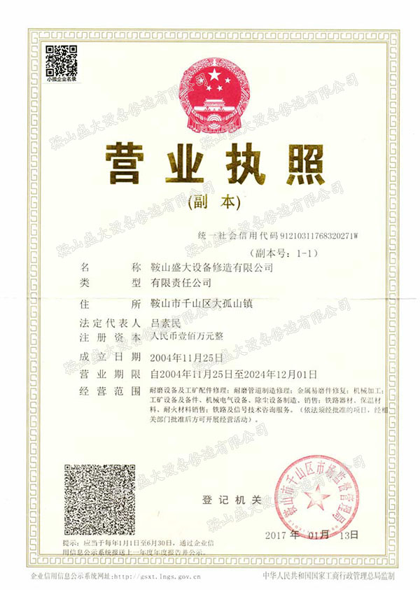 鞍山盛大設(shè)備修造有限公司位于鞍山市千山區(qū)大孤山鎮(zhèn)。堅持以“卓越的產(chǎn)品性能、安全的質(zhì)量保證、良好的售后服務(wù)”為企業(yè)發(fā)展理念,為客戶提供滿意的服務(wù)。隨著公司的進(jìn)一步發(fā)展壯大,作為礦業(yè)企業(yè)節(jié)支增收的好幫手,秉承“你給我一個機(jī)會,我還你一份貢獻(xiàn)”的經(jīng)營思路,努力為礦山企業(yè)的發(fā)展多做貢獻(xiàn)。